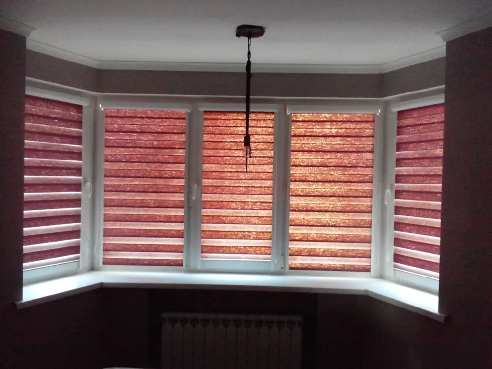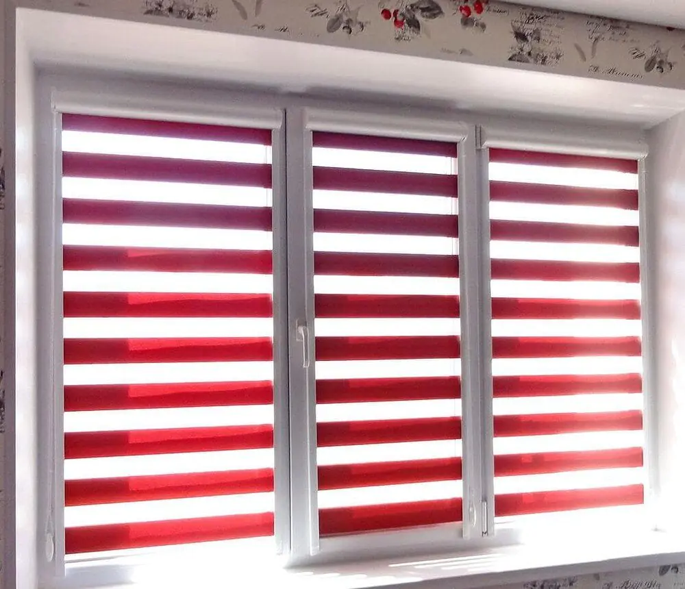 - Регулировка освещения. Возможность гибко управлять световым потоком, чередуя прозрачные и плотные полосы ткани, позволяет добиться как рассеянного света, так и полного затемнения, а также полностью открыть световой проем окна.